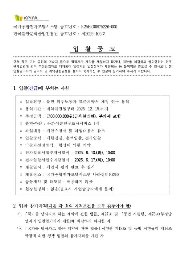- 긴급입찰공고 사유 확인서_출판 외주노동자 표준계약서 제정 연구 용역.pdf (54.3K) DATE : 2025-05-29 09:39:12